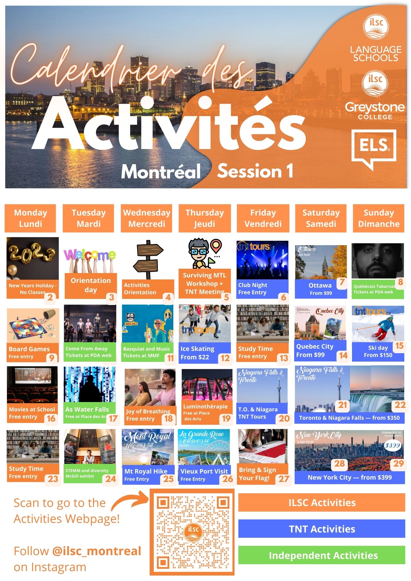 Montreal Session 1 Activities Calendar